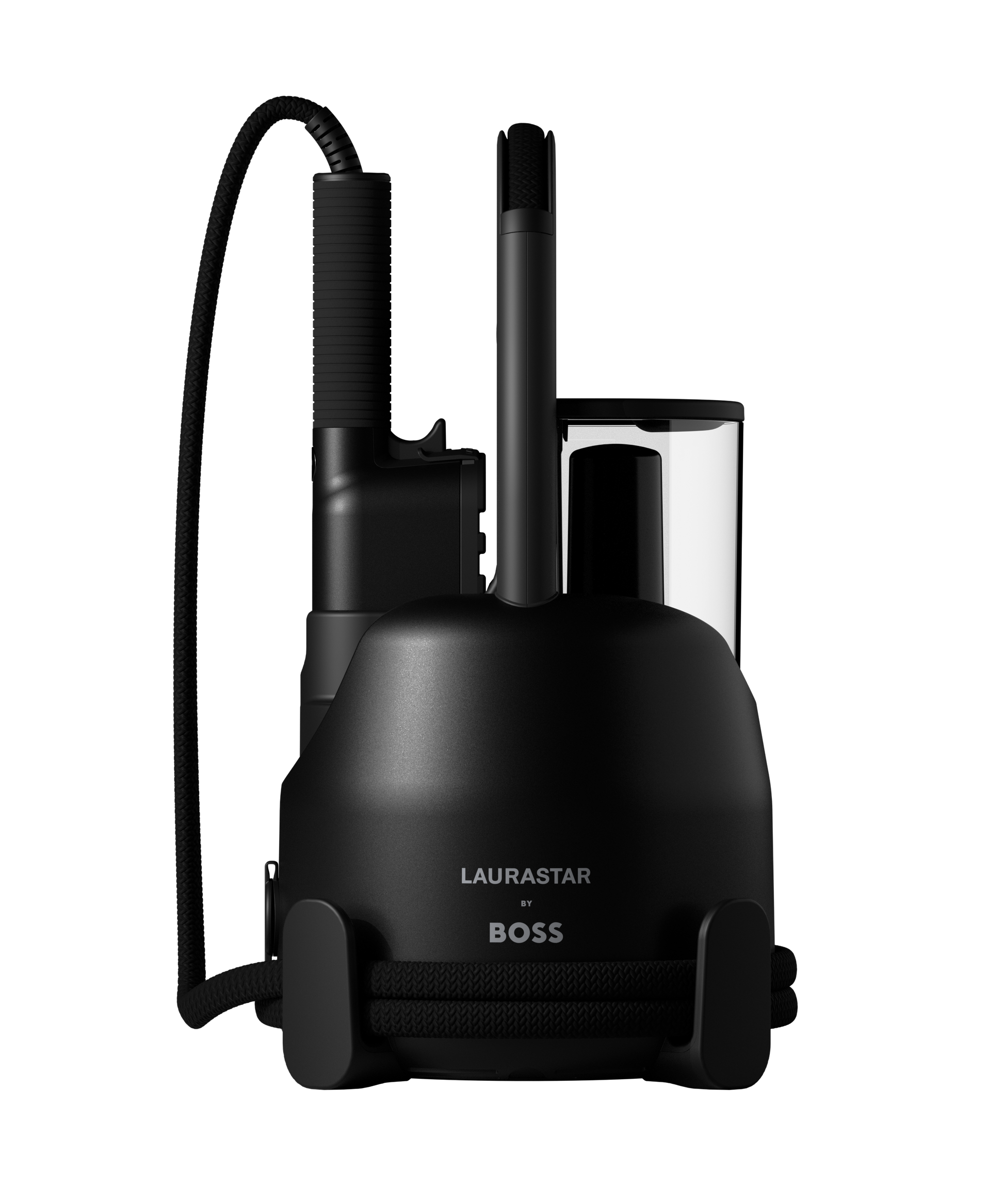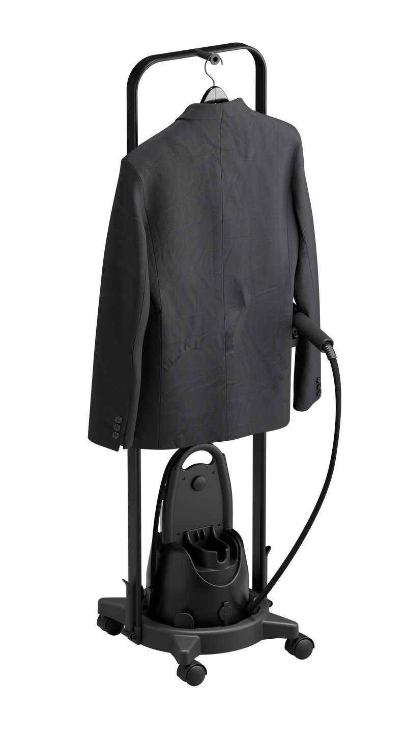 The “Laurastar by BOSS” IZZI Cart is the clever assistant for your “Laurastar by BOSS” IZZI. Featuring a convenient hook, it allows you to easily steam or refresh garments on a hanger, elevating your style with every use. With its sleek black matte brushed finish and smooth-rolling wheels, it effortlessly moves your IZZI steamer around the house, blending practicality with the distinctive BOSS aesthetic.
