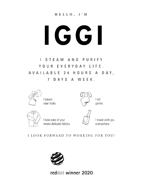IGGI is the first compact and stylish hygienic steamer that disinfects fabrics and objects. With its powerful hygienic Dry Microfine Steam (DMS), IGGI disinfects small everyday objects in the blink of eye, whether you’re at home or travelling: clothes, bags, toys, fabric masks, helmets, door handles, cushions, glasses, keys, baby items, etc. Compact and portable, it fits easily into a bag or suitcase and will travel with you everywhere. This hygienic steamer helps to reduce allergies and the risk of infections linked to bacteria, viruses and fungi. It also significantly reduces bad odours. Enjoy a healthier living environment thanks to IGGI!